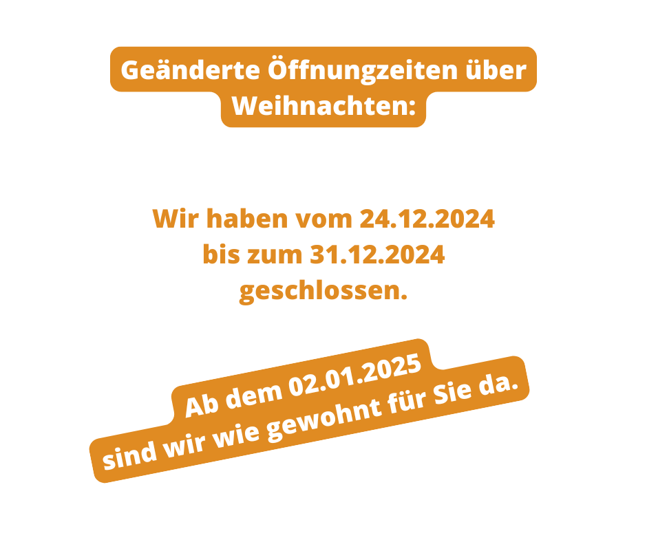 Zwischen den Feiertagen erholen wir uns mit unseren Familien und sind ab dem 02.01.2025 gerne wieder für Sie da.